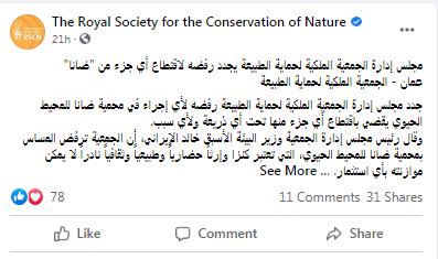 قال رئيس مجلس ادارة الجمعية الملكية لحماية الطبيعة خالد الايراني إن مجلس الوزراء قرر اقتطاع مساحة كبيرة من محمية ضانا وبدون اخذ رأي الجمعية. و وصف ذلك بأنه يوم أسود في حماية الطبيعة..