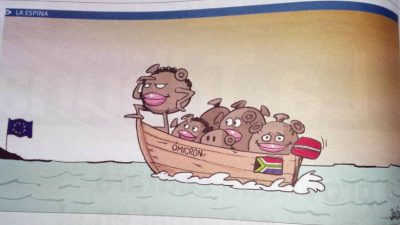 The German newspaper DIE RHEINPFALZ wrote a huge, front-page headline reading “The Virus from Africa is with us.” Furthermore, the Spanish newspaper, Tribuna de Albacete, has drawn a cartoon where Omicron variant particles are portrayed as black South Africans riding a boat, with the South Africa's flag on it, and heading toward the EU.