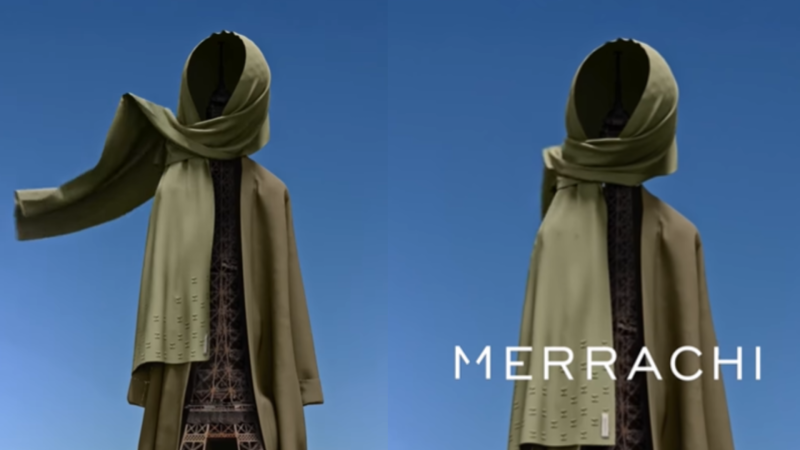 The video features the Eiffel Tower wearing a abaya (usually worn in Arab countries), as a hijab comes floating on its head, following Merrachi's logo that fades in at the end.