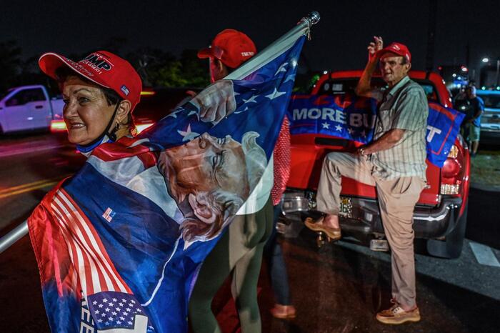 Supporters of former US President Donald Trump stand outside his residence in Mar-A-Lago, Palm Beach, Florida on August 8, 2022. Former US president Donald Trump said August 8, 2022 that his Mar-A-Lago residence in Florida was being "raided" by FBI agents in what he called an act of "prosecutorial misconduct." (Photo by Giorgio Viera / AFP)