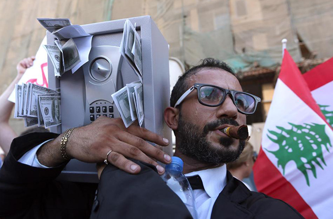 How do you dress up as "corruption"? Try on an exploding cash machine for size. We can't say why he went with US greenbacks - possible they weigh less than Lebanese 'pounds'? - nor verify whether jewelry is de rigeur for crooked pols, or if it's just this protester's usual 'bling'.