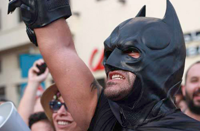 HOLY STEAMING PILES OF GARBAGE, BATMAN! This joker went full 'super-hero' in support of the protests, and his facemask did double duty as a stench-blocker.