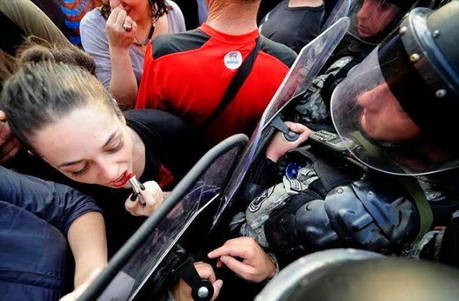 The noxious trash fumes make mouth-breathing a demonstration must - necessary for survival but hell on your lipstick! This protester turned a cop's reflective shield into her own personal makeup mirror. Who needs a handbag full of girly gear when you've got riot police around?