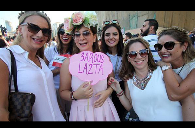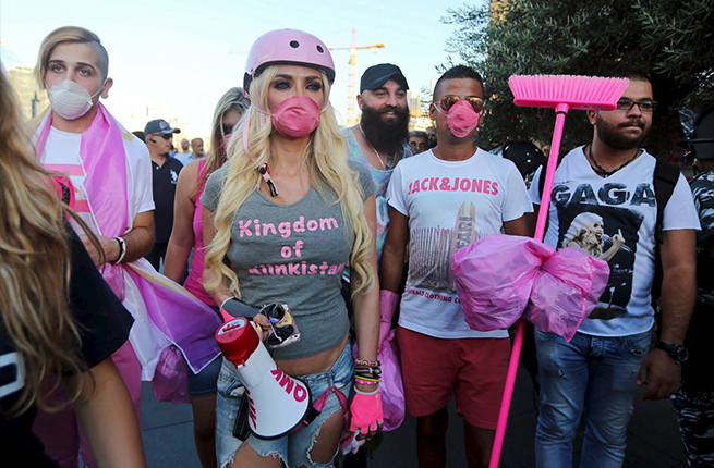 Lebanese model-turned-singer Miryam Klink joined the protest with a posse of pink cleaners. Notorious for her provocative wardrobe and overtly sexual dance moves, critics claim she should maybe clean up her act instead.
