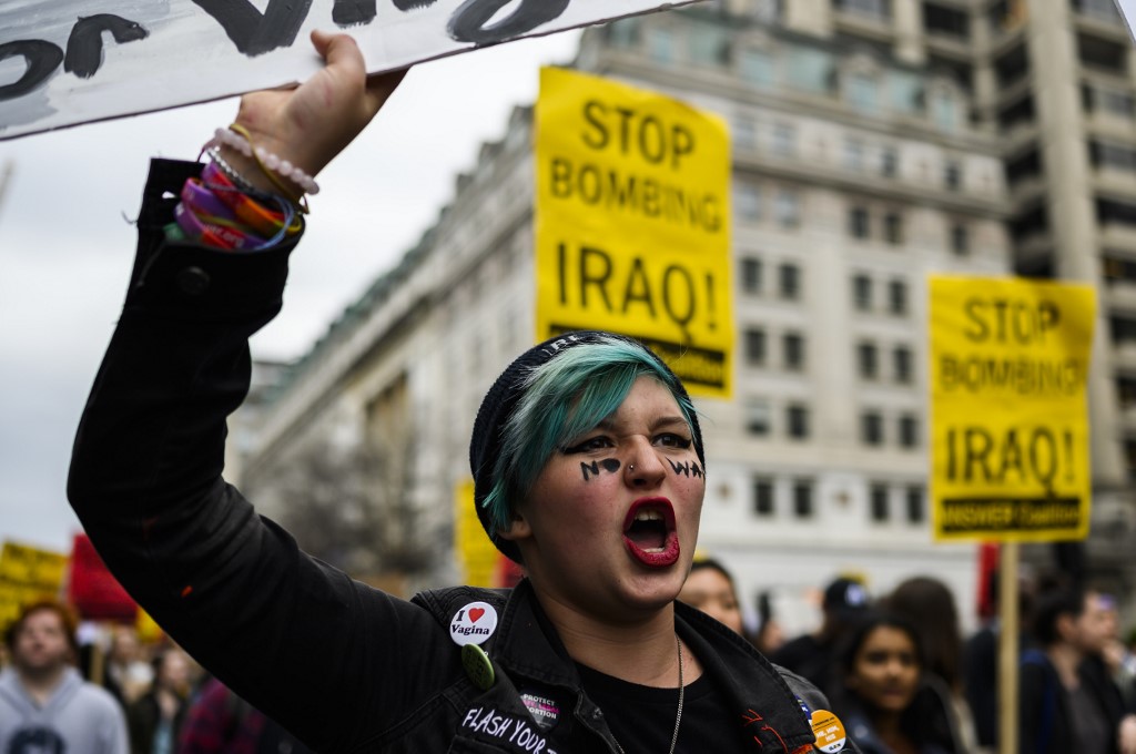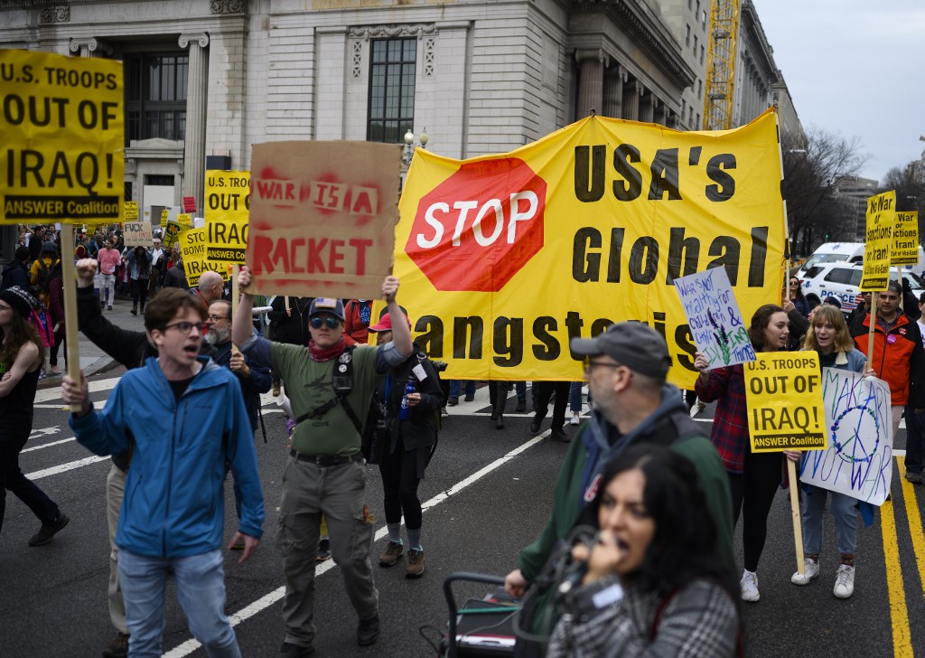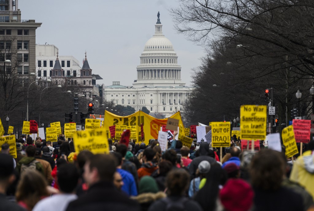 At least 200 people gathered outside the White House as part of a wave of rallies called by left-leaning organizations against starting a war with Iran after the US killing of Qasem Soleimani on January 3, 2020, in Baghdad, Iraq.