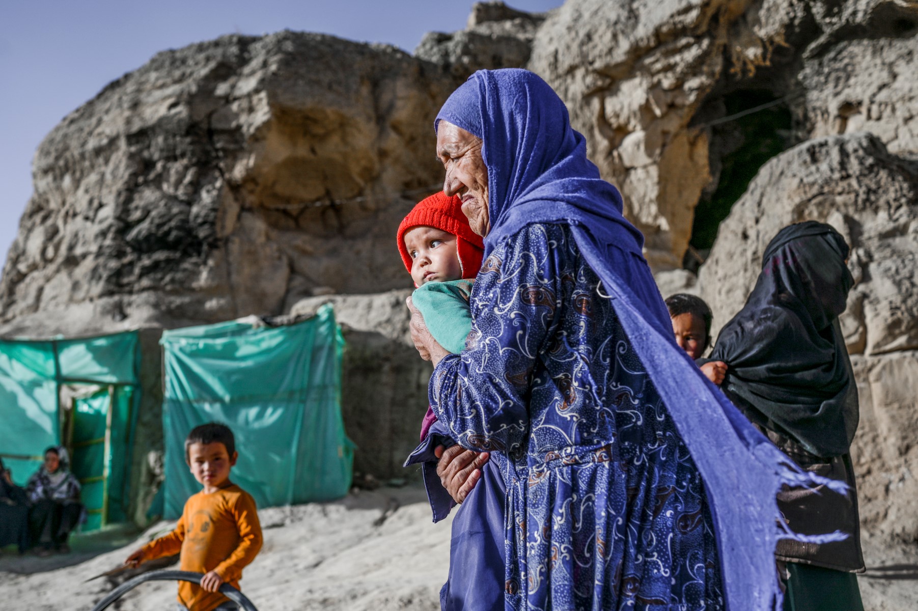 In this picture taken on October 3, 2021, a Hazara ethnic woman with a baby walks in front of her cave on a cliff pockmarked by caves where people still live as they did centuries ago in Bamiyan. (Photo by Bulent KILIC / AFP)
