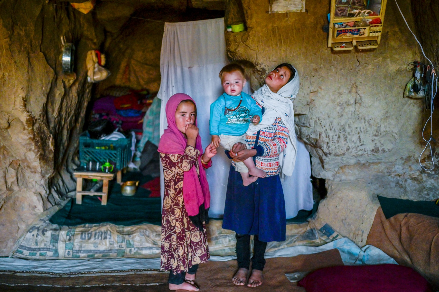 In this picture taken on October 3, 2021, Hazara ethnic children stand in their cave on a cliff pockmarked by caves where people still live as they did centuries ago in Bamiyan.
