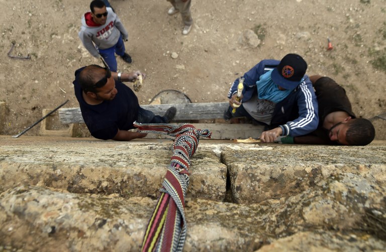Experts and students from Algiers University’s Archaeology Institute work on one of the Jeddars pyramid tombs, near the city of Tiaret. RYAD KRAMDI / AFP