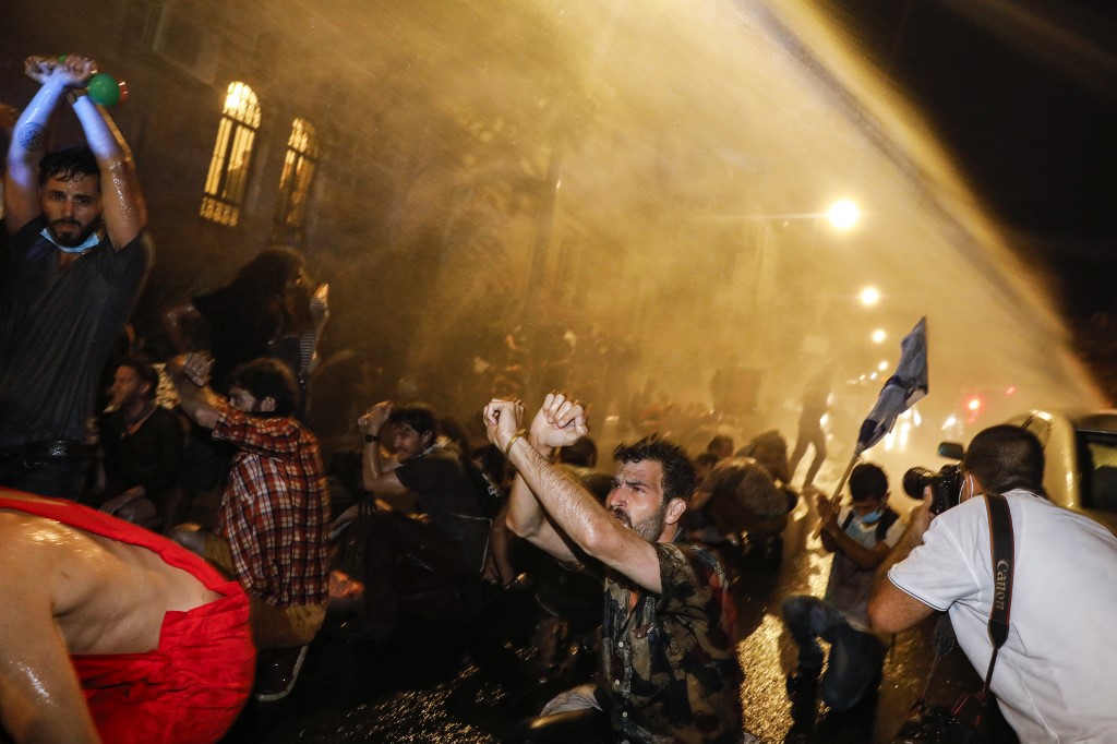 Israeli police spray protesters (clad in masks due to the COVID-19 coronavirus pandemic) with water cannon during an anti-government demonstration in Jerusalem, on July 18, 2020. Ahmad GHARABLI / AFP