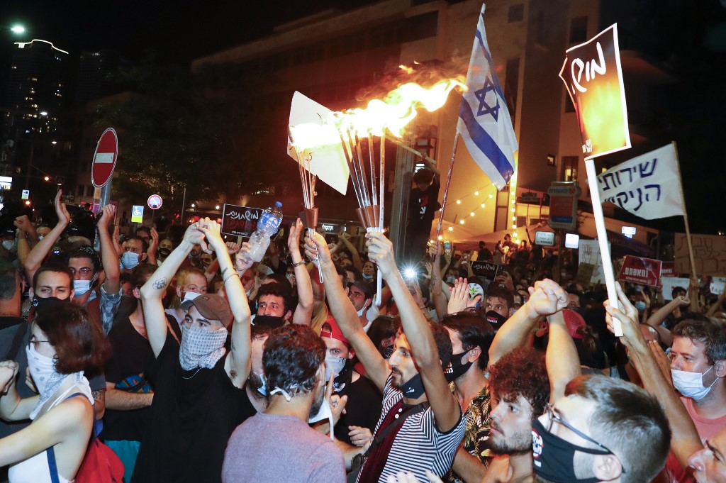 Israelis wearing protective face masks due to the COVID-19 coronavirus pandemic, take part in a demonstration on July 18, 2020, in Charles Clore Park in the Israeli coastal city of Tel Aviv to protest against the Israeli government and Prime Minister Benjamin Netanyahu for the broken promises made by the Israeli government during the Covid-19 pandemic. Israel's government said today it was imposing new restrictions to limit the spiraling spread of coronavirus.