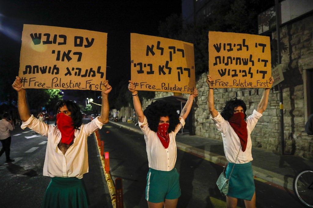 Israeli demonstrators lift placards during a rally against Prime Minister Benjamin Netanyahu outside his official residence in Jerusalem, on July 18, 2020, amid the coronavirus pandemic. Israeli police fired water cannons to disperse anti-government protests attended by thousands on Saturday, as public anger mounts over the handling of the coronavirus crisis.