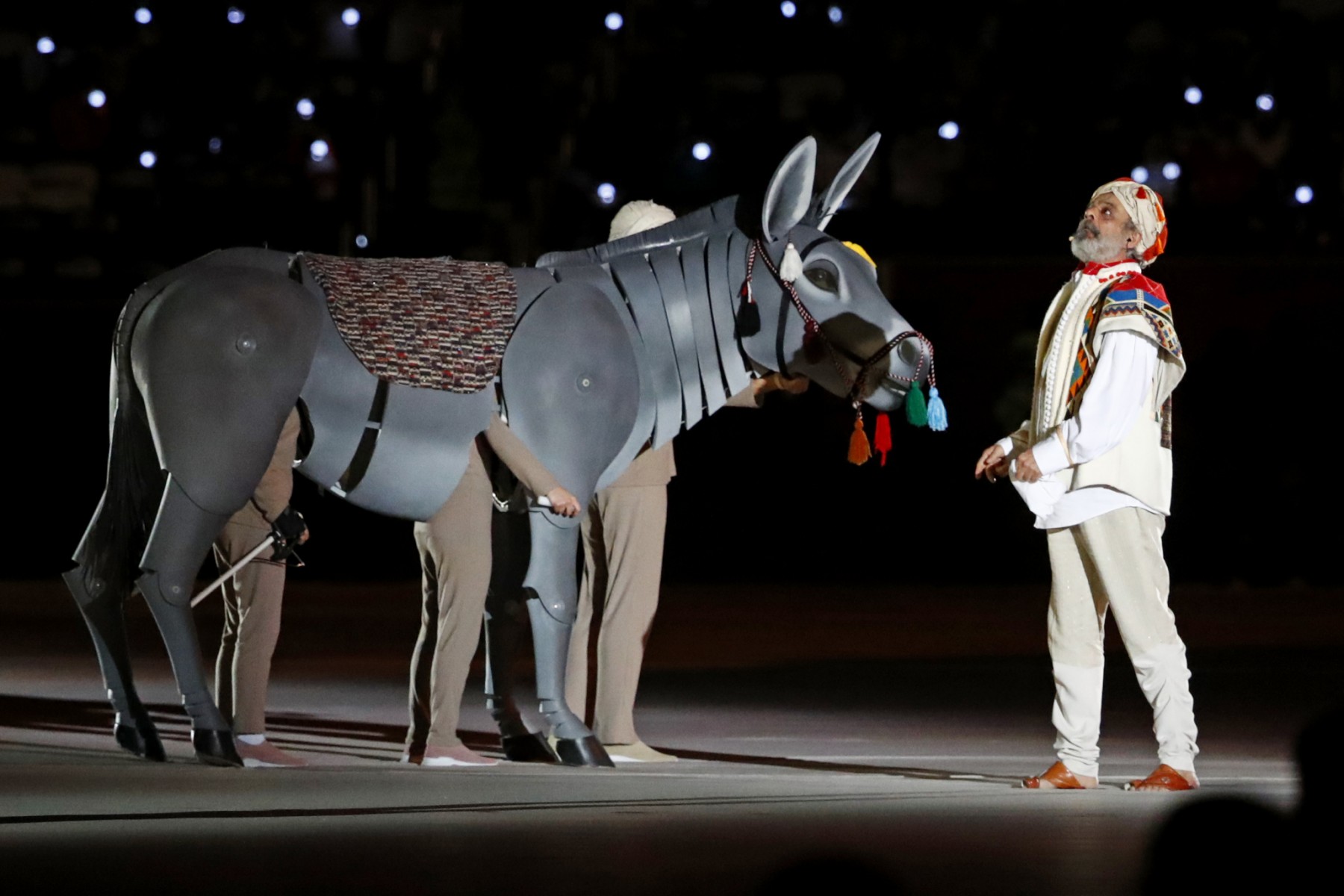 Performers take part in the opening ceremony of the FIFA Arab Cup 2021 at the Al-Bayt Stadium in Al-Khor on November 30, 2021, ahead of the group A football match between Qatar and Bahrain. (Photo by Khaled DESOUKI / AFP)