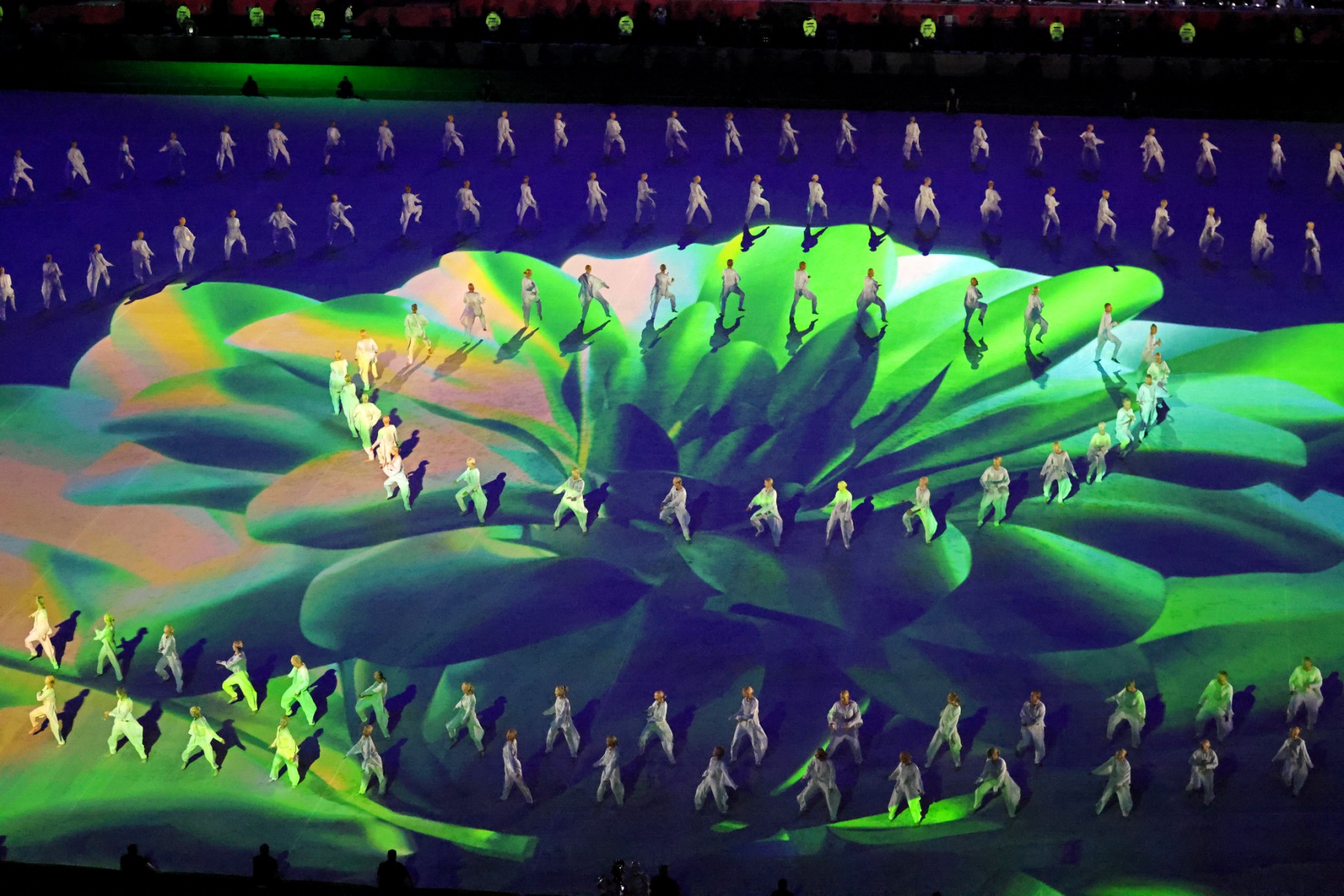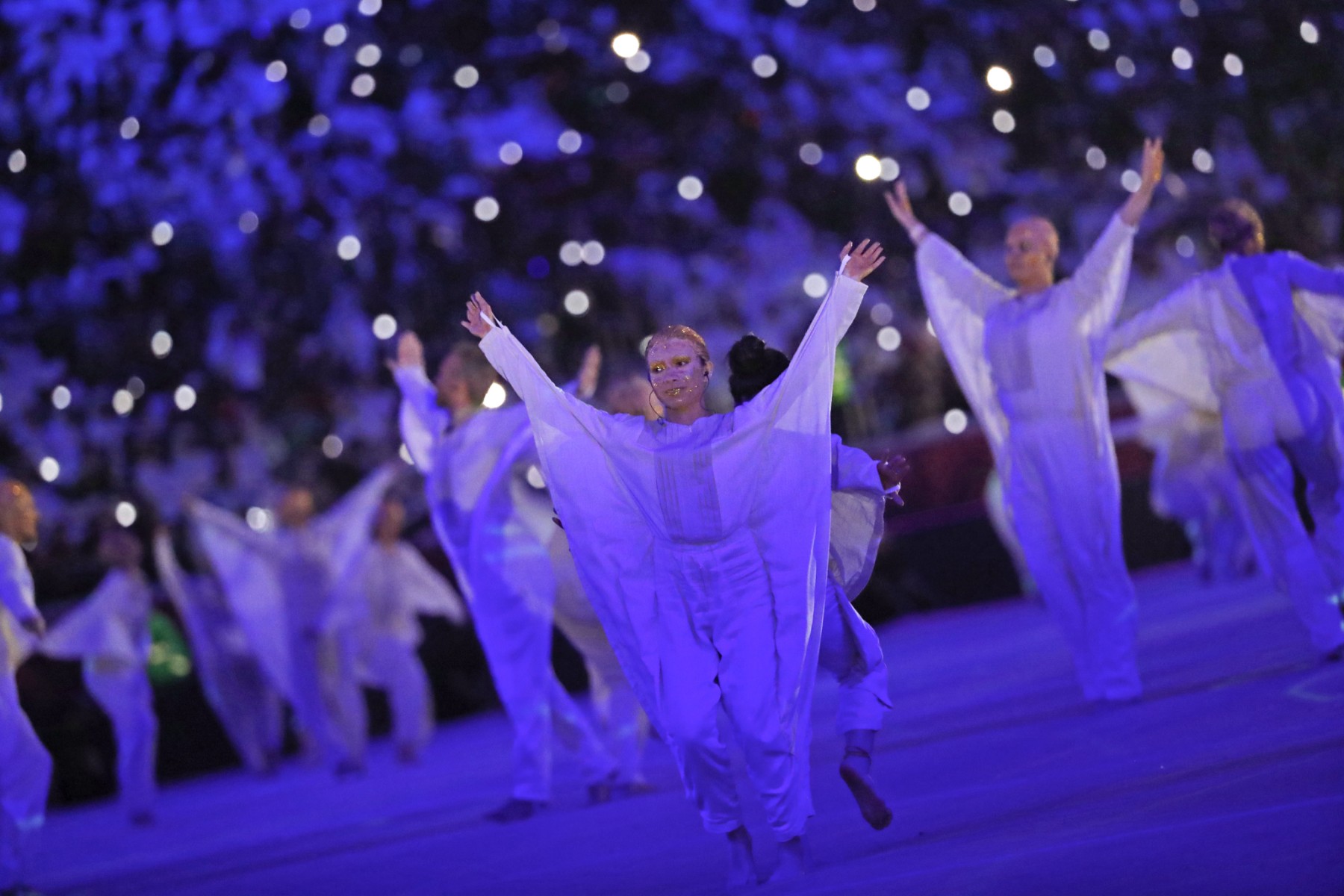 Dancers perform during the opening ceremony of the FIFA Arab Cup 2021 at the Al-Bayt Stadium in Al-Khor on November 30, 2021, ahead of the group A football match between Qatar and Bahrain. (Photo by KARIM SAHIB / AFP)