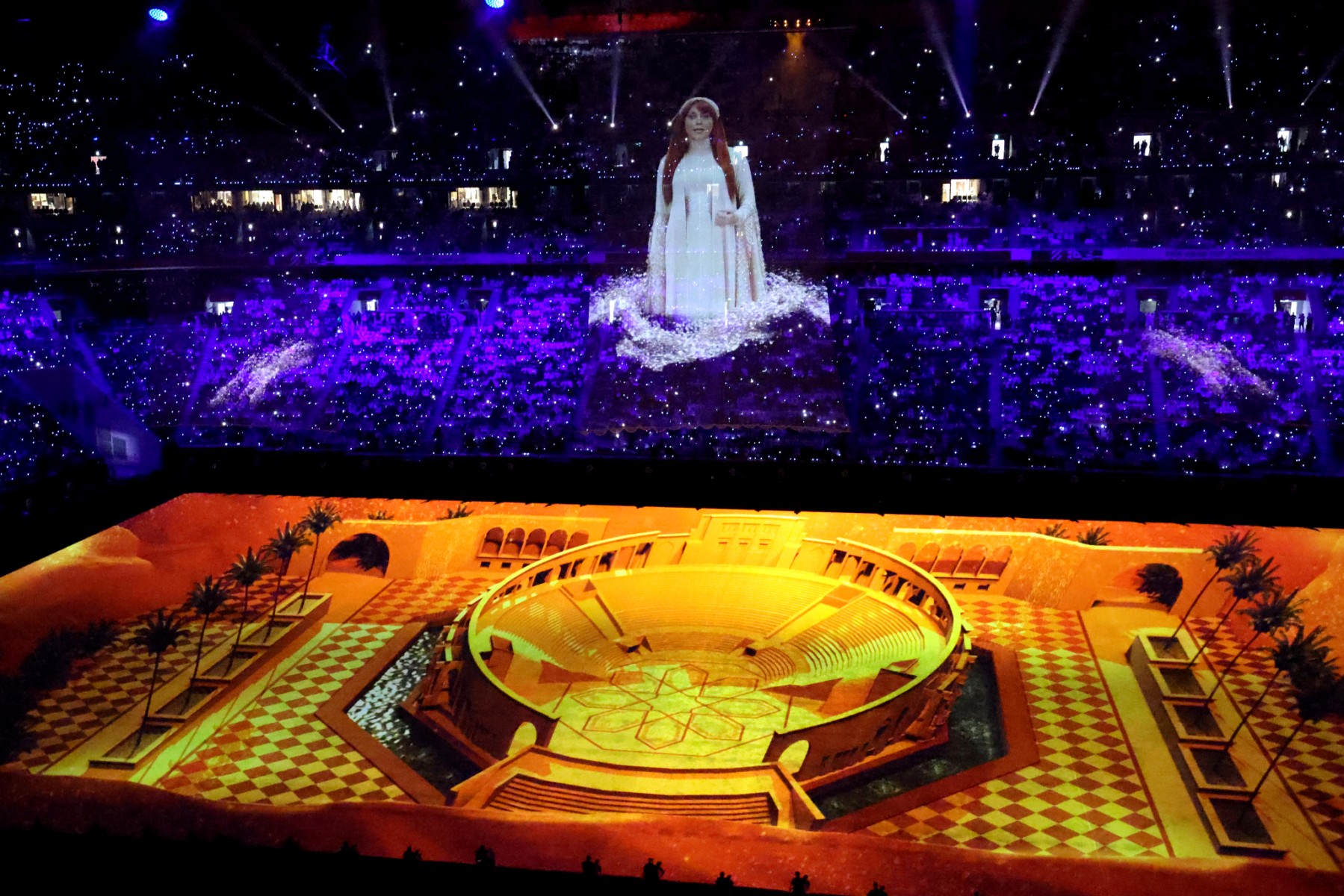 Lebanese diva Fairuz (Fayrouz) hologram during the opening ceremony of the FIFA Arab Cup 2021 at the Al-Bayt Stadium in Al-Khor on November 30, 2021, ahead of the group A football match between Qatar and Bahrain. (Photo by KARIM SAHIB / AFP)