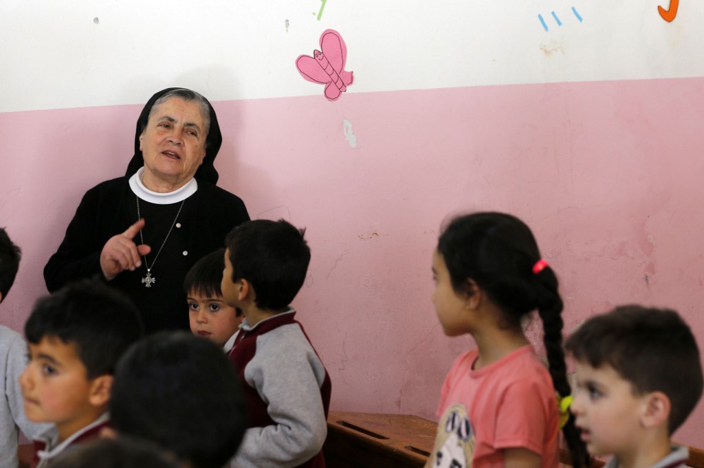 Angel Allam, a nun and teacher instructs her students in the Aramaic language, the biblical language of Jesus, at a school in the mountain village of Maalula, in Syria's Damascus region on May 13, 2019. LOUAI BESHARA / AFP