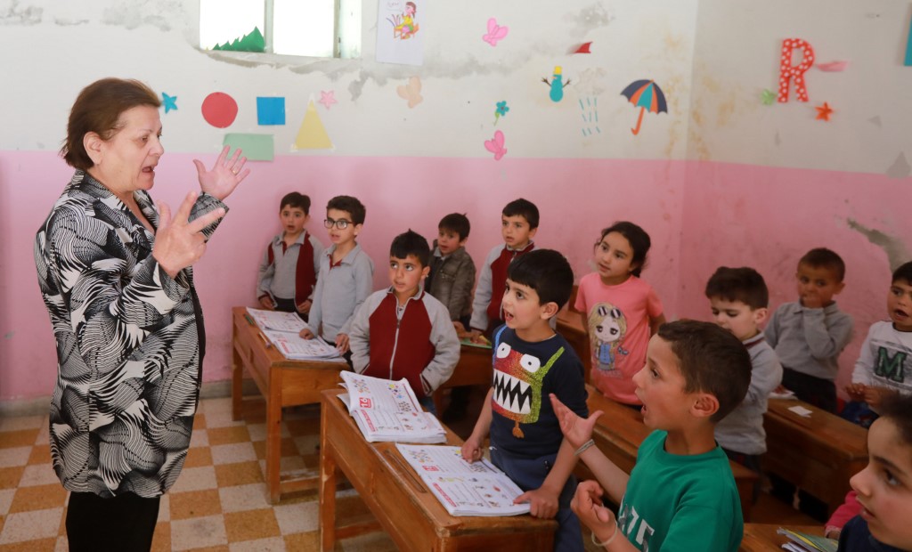 Antoinette Makh, instructs her pupils in the Aramaic language at a school in the Syrian mountain village of Maalula, in the Damascus region on May 13, 2019. LOUAI BESHARA / AFP