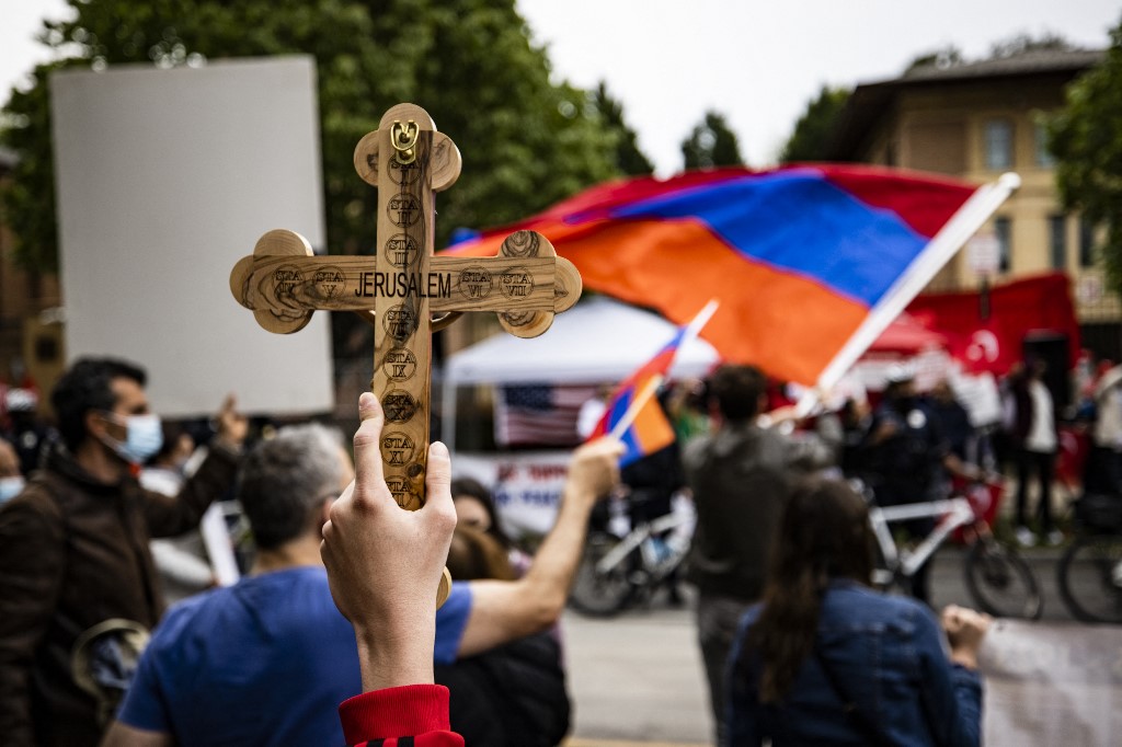 Armenians protest outside of the Turkish Embassy on the 106th anniversary of the 1915 Armenian Genocide in Washington, DC on April 24, 2021. President Joe Biden's recognition of the Armenian genocide was met Saturday by tempered satisfaction from the nation's US diaspora, with some saying the words need to result in more pressure against Turkey. Samuel Corum / AFP