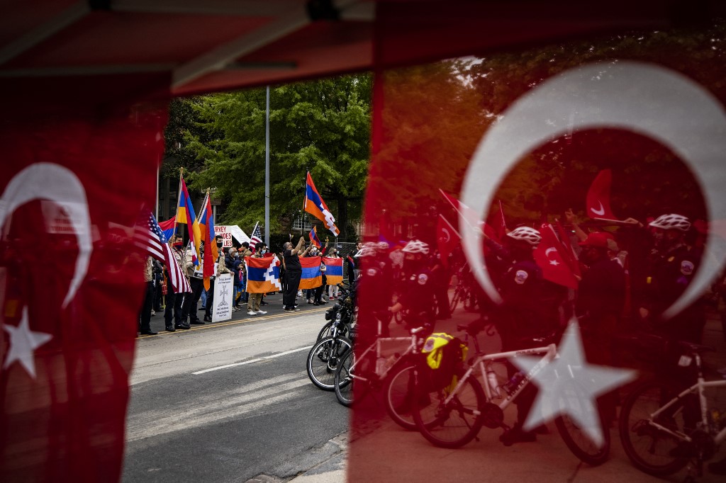 Turkish counter-protestors are kept apart from Armenian protestors to avoid confrontation in front of the Turkish Embassy on the 106th anniversary of the 1915 Armenian Genocide in Washington, DC on April 24, 2021. Samuel Corum / AFP