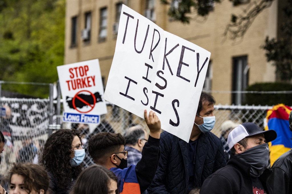 Armenians protest outside of the Turkish Embassy on the 106th anniversary of the 1915 Armenian Genocide in Washington, DC on April 24, 2021. President Joe Biden's recognition of the Armenian genocide was met Saturday by tempered satisfaction from the nation's US diaspora, with some saying the words need to result in more pressure against Turkey.