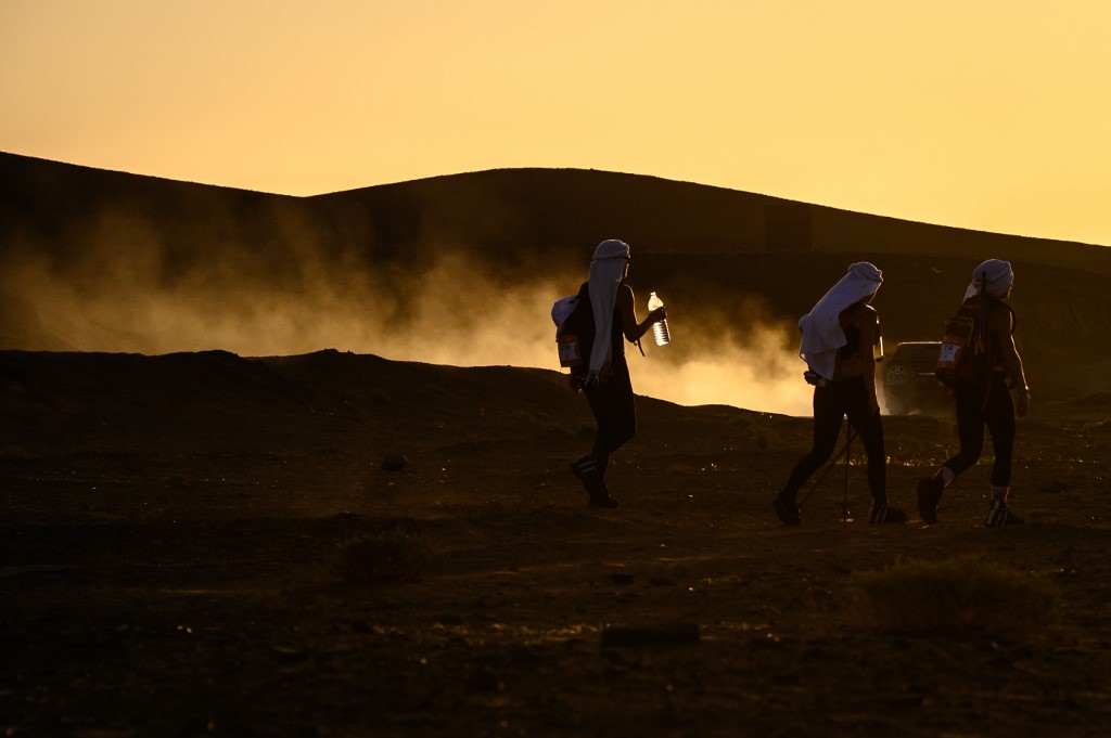 Women take part in the desert trek "Rose Trip Maroc", on November 4, 2019 in the erg Chebbi near Merzouga. The Rose Trip Maroc is a female-oriented trek where teams of three must travel through the southern Moroccan Sahara desert with a compass, a map and a topographical reporter. JEAN-PHILIPPE KSIAZEK / AFP