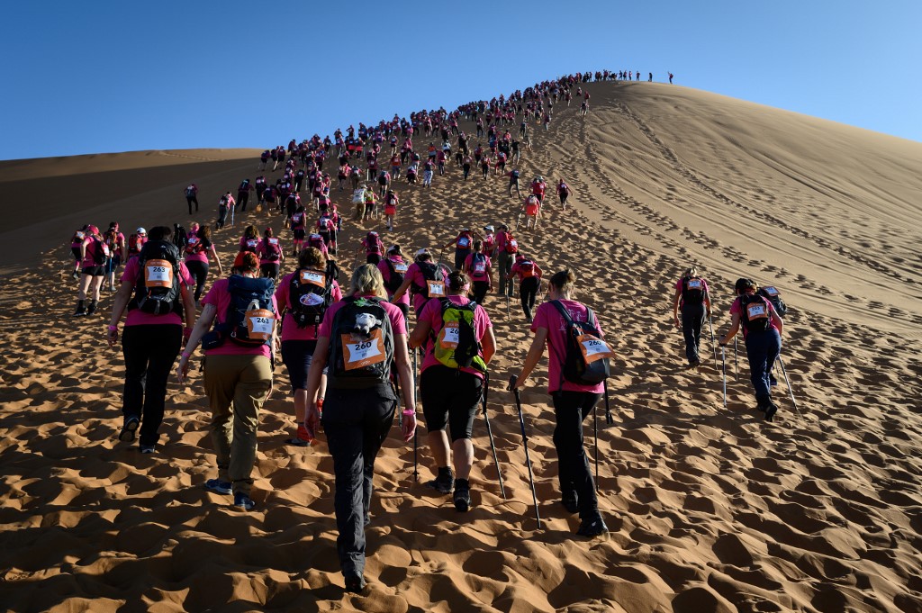 Women climb up a sand dune as they take part in the desert trek "Rose Trip Maroc", on November 4, 2019 in the erg Chebbi near Merzouga. The Rose Trip Maroc is a female-oriented trek where teams of three must travel through the southern Moroccan Sahara desert with a compass, a map and a topographical reporter. JEAN-PHILIPPE KSIAZEK / AFP