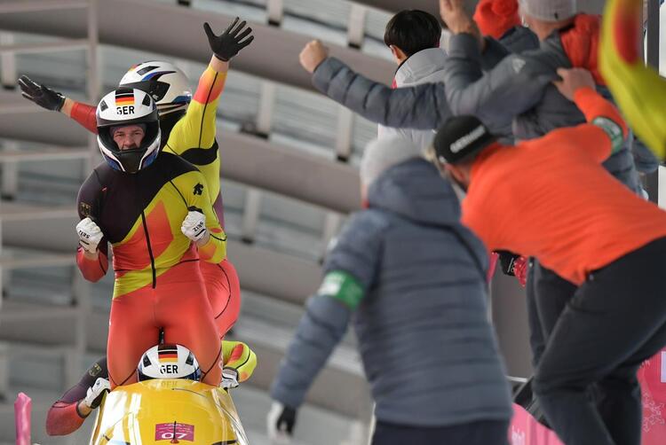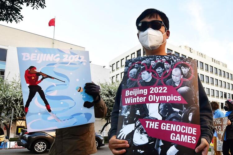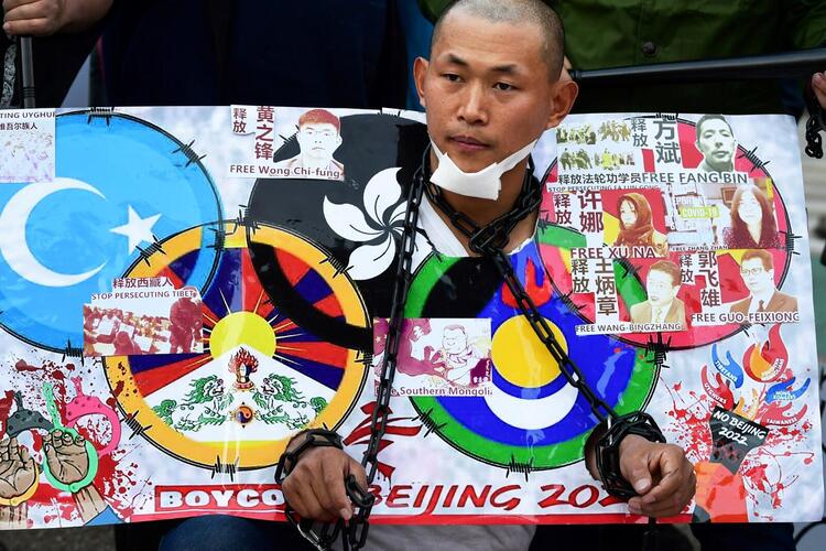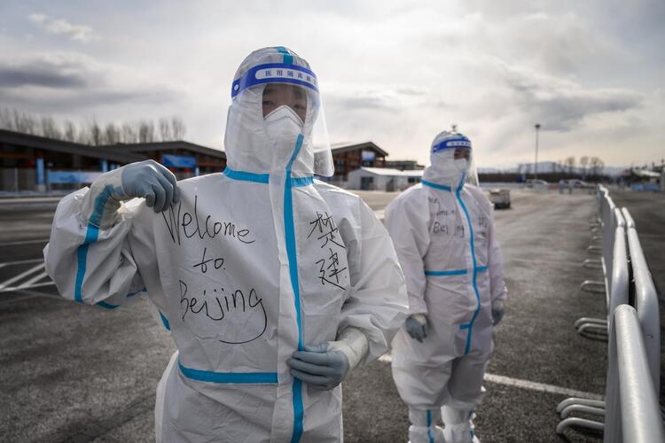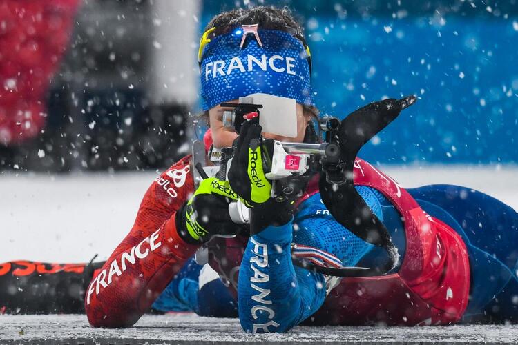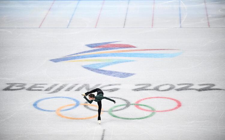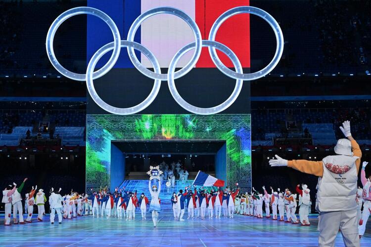 The delegation from France takes part in the parade of athletes, underneath the Olympics rings, during the opening ceremony of the Beijing 2022 Winter Olympic Games, at the National Stadium, known as the Bird's Nest, in Beijing, on February 4, 2022. (Photo by Ben STANSALL / AFP)