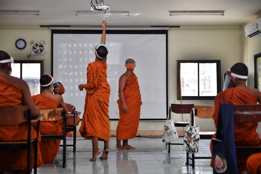 A novice monk wearing a face shield as a preventive measure against the spread of the COVID-19 coronavirus turns off a projector during religious studies at Wat Molilokkayaram Buddhist temple in Bangkok on April 20, 2020. Lillian SUWANRUMPHA / AFP