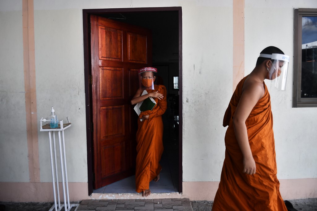 Novice monks wearing face shields as a preventive measure against the spread of the COVID-19 coronavirus leave the classroom after religious studies at Wat Molilokkayaram Buddhist temple in Bangkok on April 20, 2020. Lillian SUWANRUMPHA / AFP