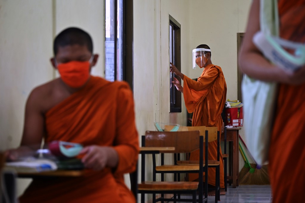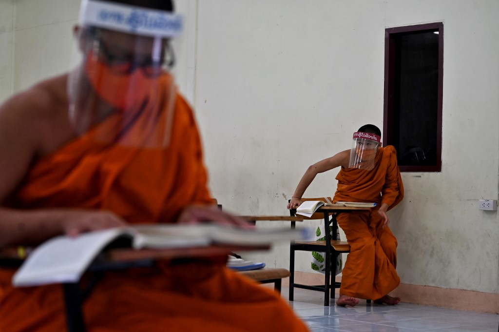 Novice monks wearing face shields as a preventive measure against the spread of the COVID-19 coronavirus attend religious studies at Wat Molilokkayaram Buddhist temple in Bangkok on April 20, 2020. Lillian SUWANRUMPHA / AFP