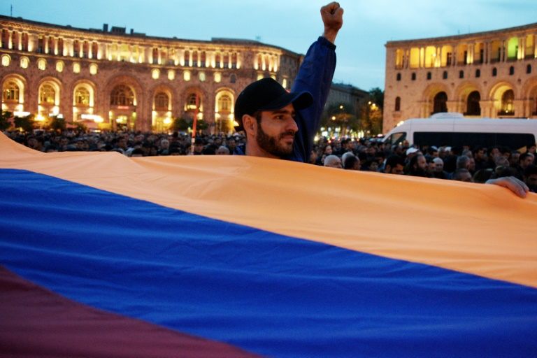 Protesters holding an Armenian flag in the main square in Yerevan  (AFP/File Photo)