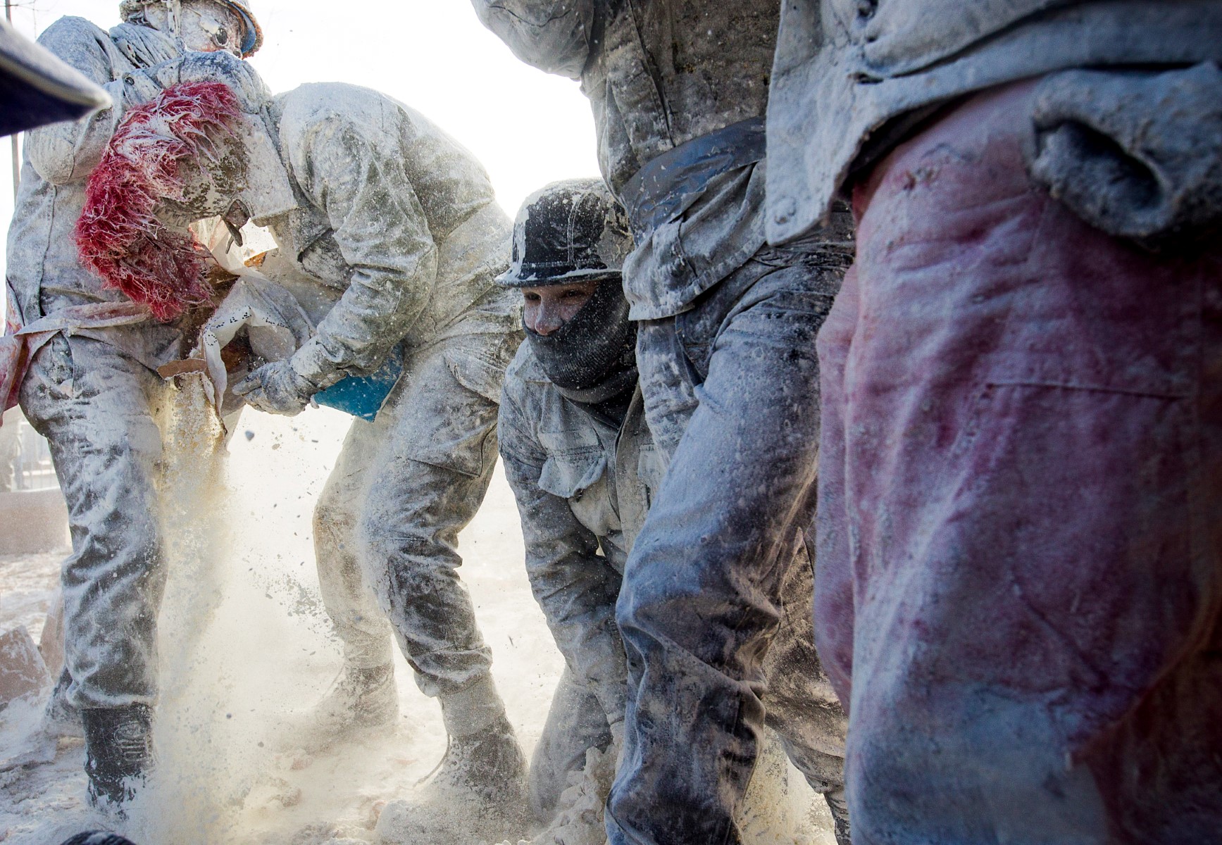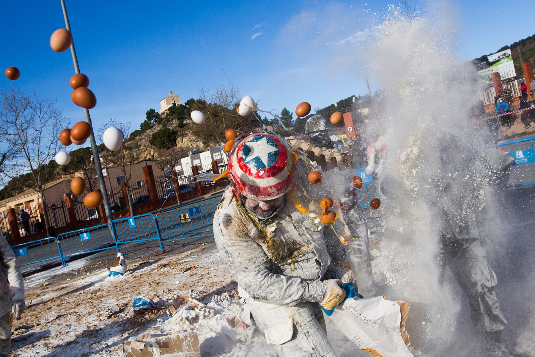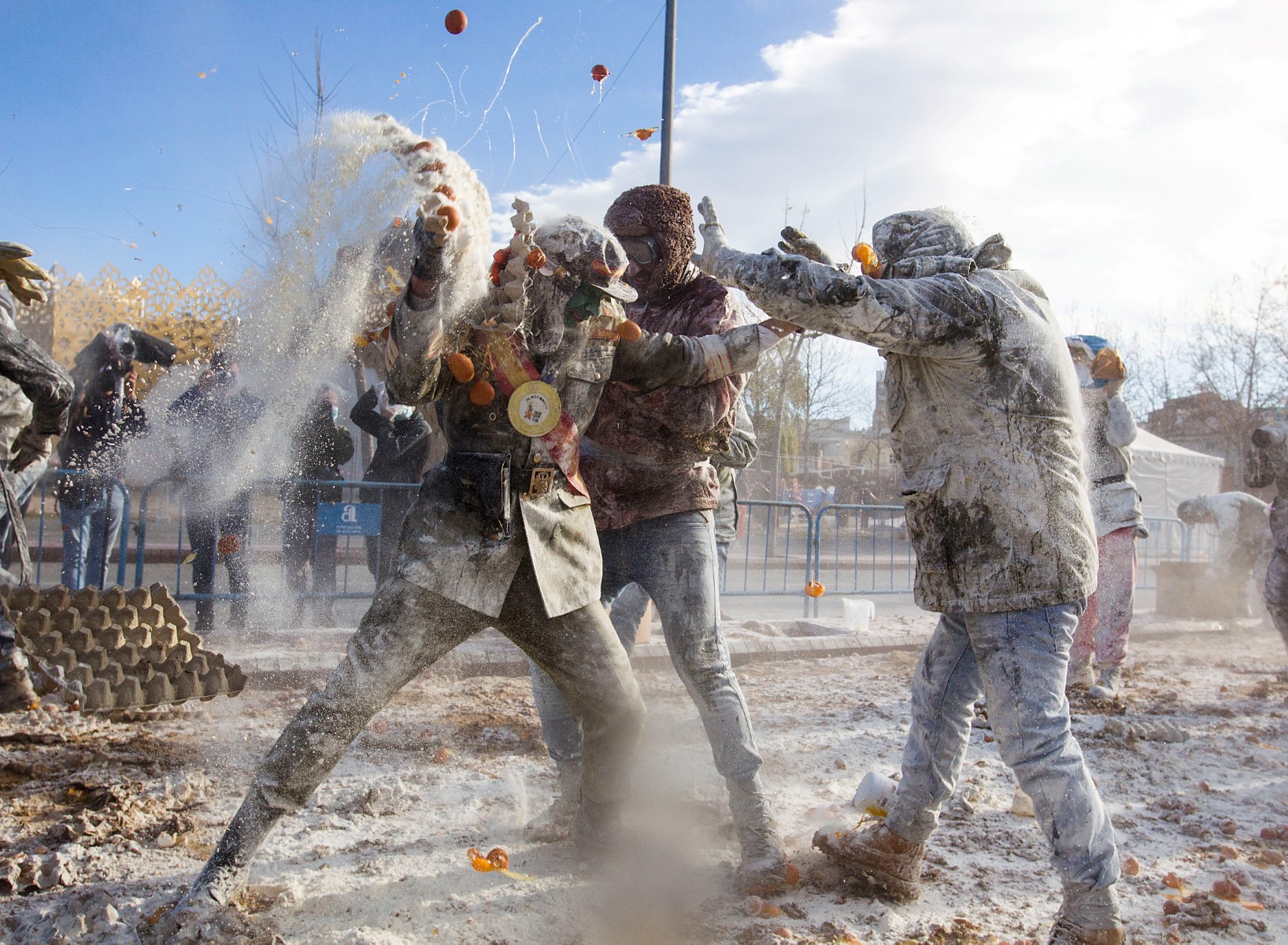 Spain's "Els Enfarinats" festival is a 200-year-old traditional event where participants wear military clothes and stage a mock coup d'etat as they battle using flour, eggs and firecrackers in the south-eastern Spanish town of Ibi.