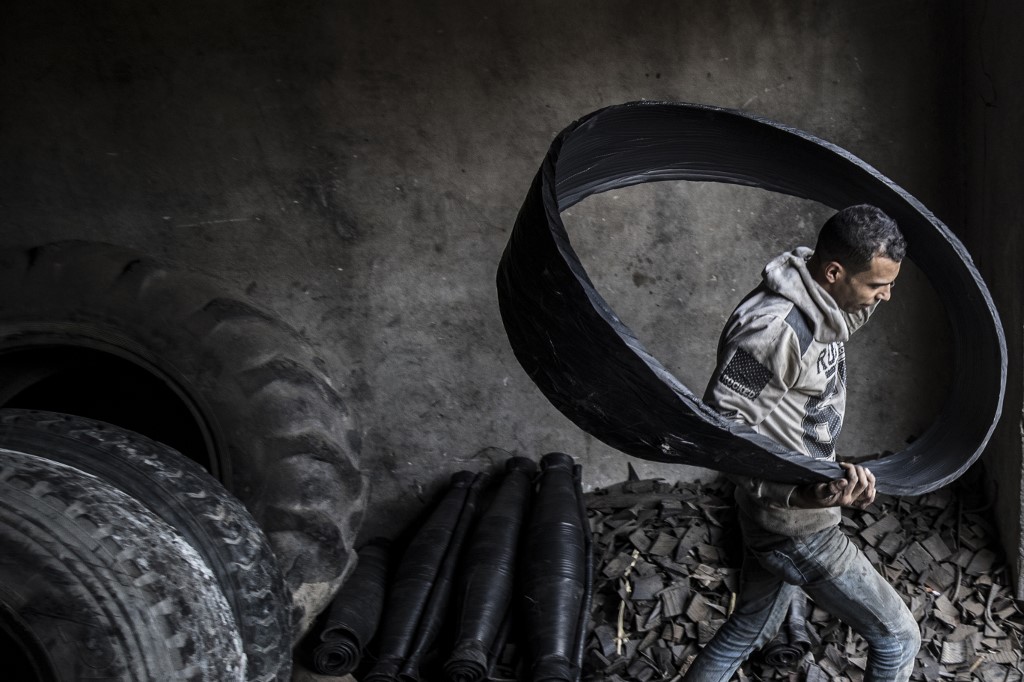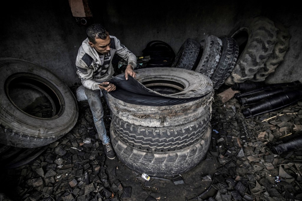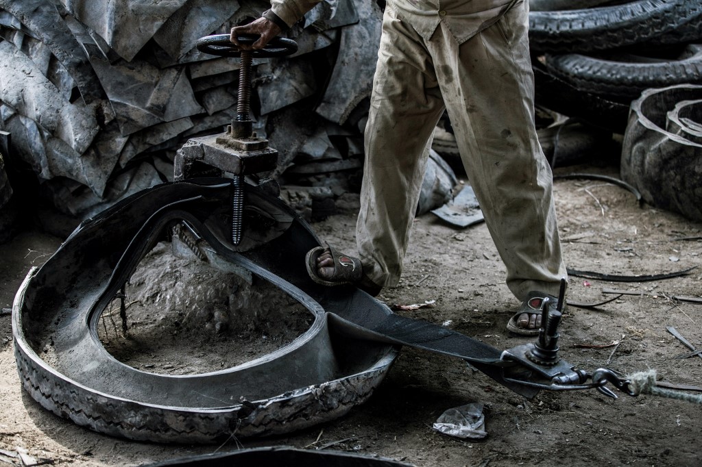 A labourer uses a knife to rip out lining from a tyre at a rubber recycling workshop in the village of Mit al-Harun in Egypt's central Nile delta Gharbia Governorate, about 70 kilometres (43 miles) north of the capital, on January 14, 2020, according to AFP.