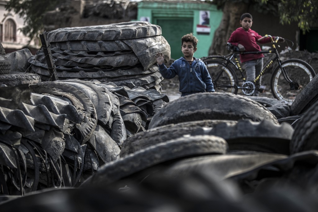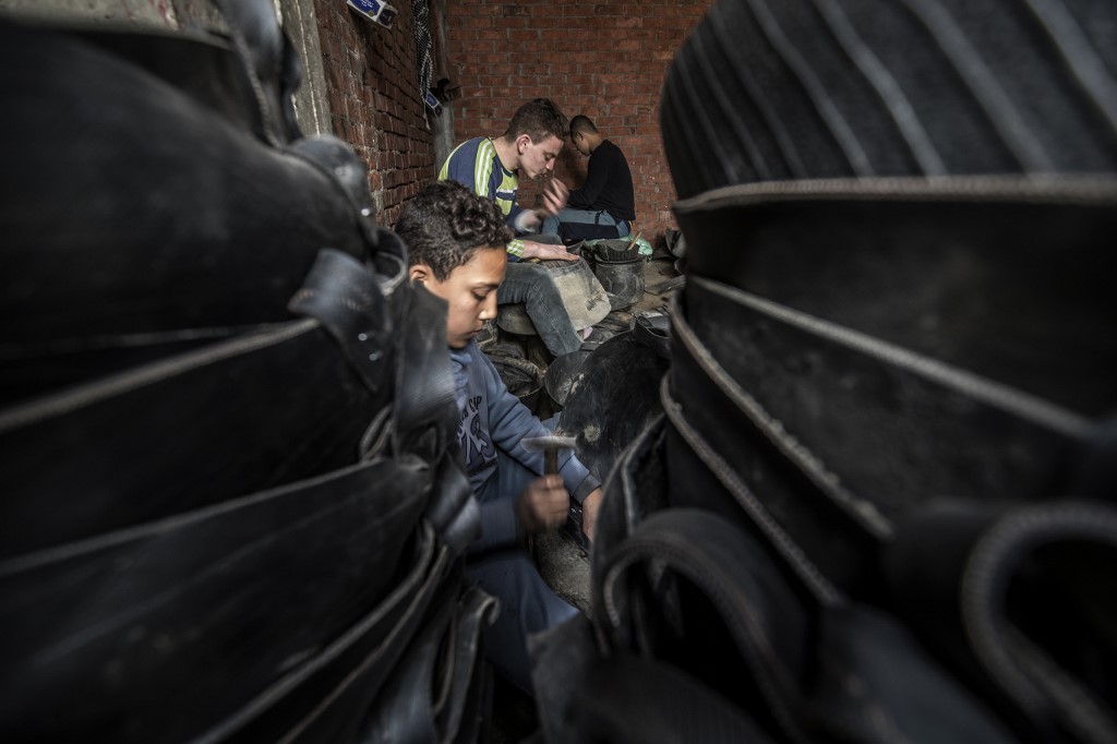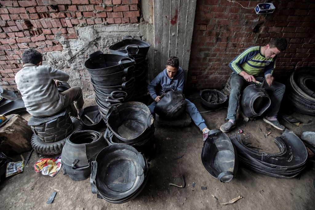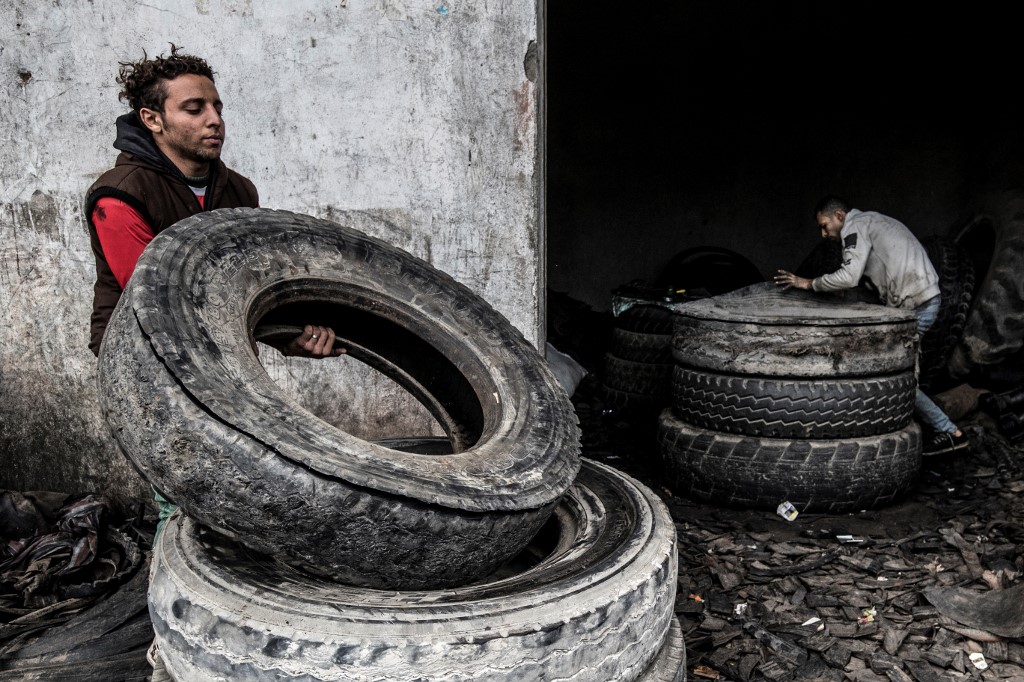 Residents of Mit al-Harun have for decades eked out a living by recycling old tyres into new rubber-based products. From early morning, workers covered in soot and dust can be seen sharpening their knives to cut the huge tyres stockpiled on the village's roadsides.