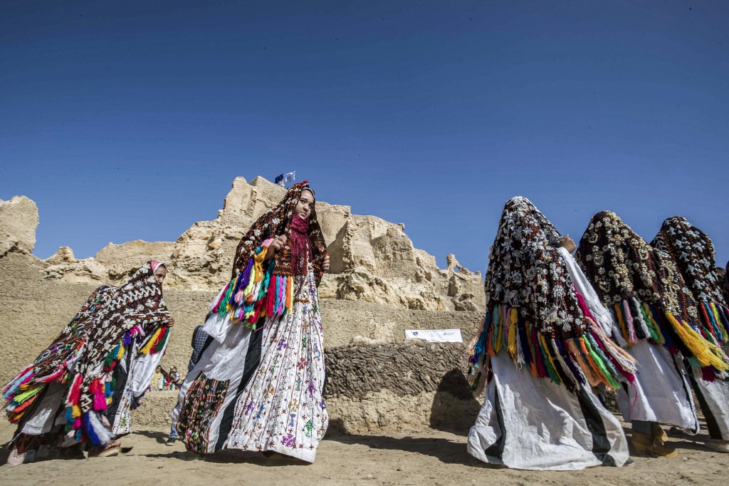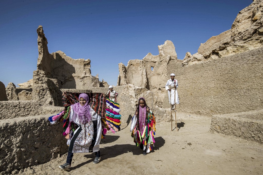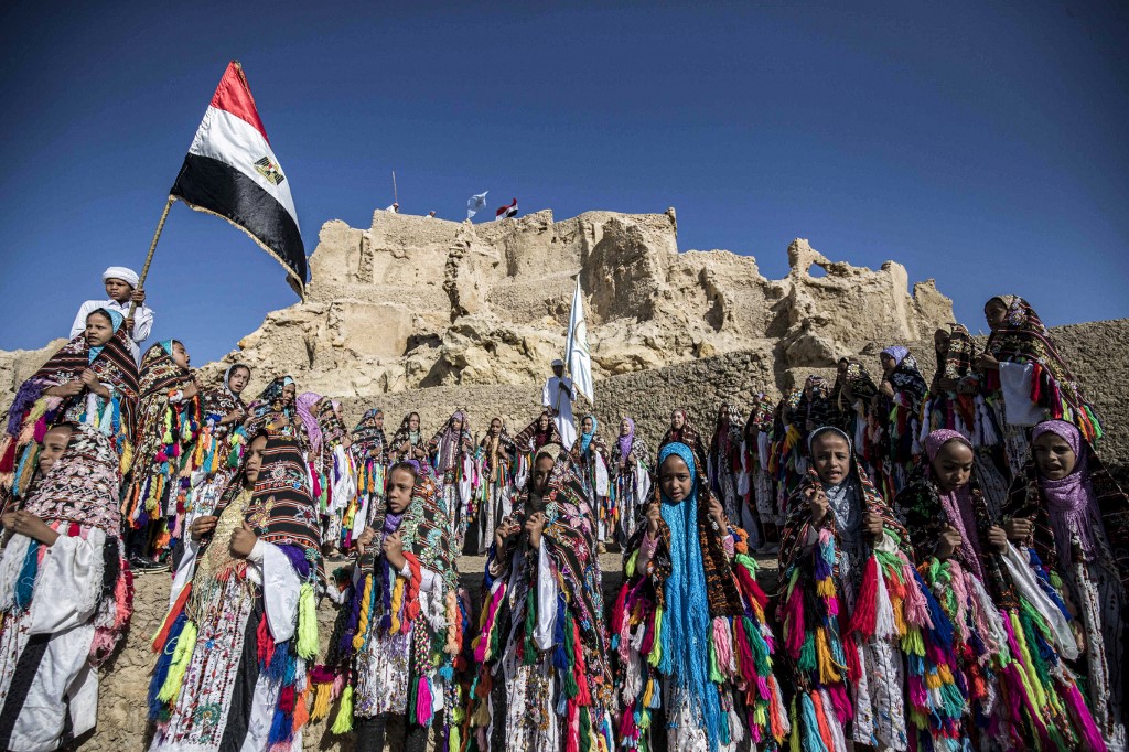 Egyptian school children dressed in traditional outfits, gather during a celebration to mark the inauguration of the fortress of Shali following its restoration, in the Egyptian desert oasis of Siwa, some 600 kms southwest of the capital Cairo, on November 6, 2020. Khaled DESOUKI / AFP