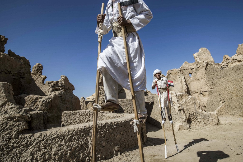 Egyptian school children dressed in traditional outfits, walk with stilts during a celebration to mark the inauguration of the fortress of Shali following its restoration, in the Egyptian desert oasis of Siwa, some 600 kms southwest of the capital Cairo, on November 6, 2020. Khaled DESOUKI / AFP