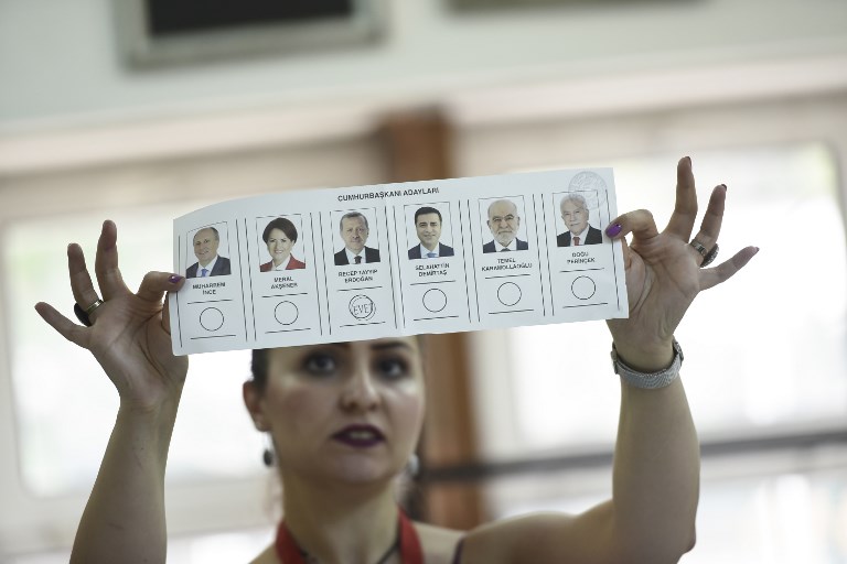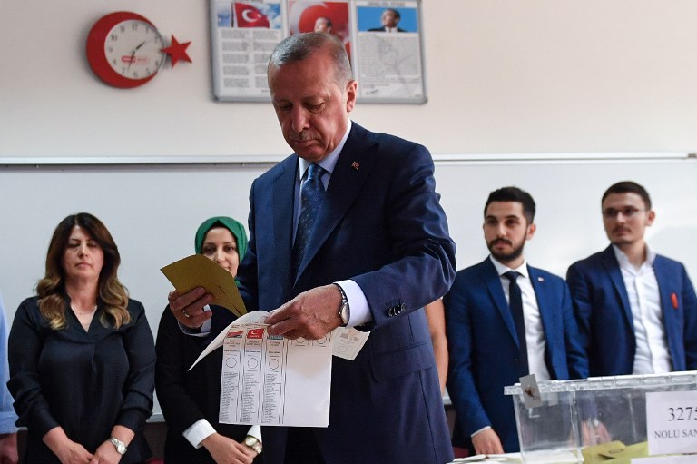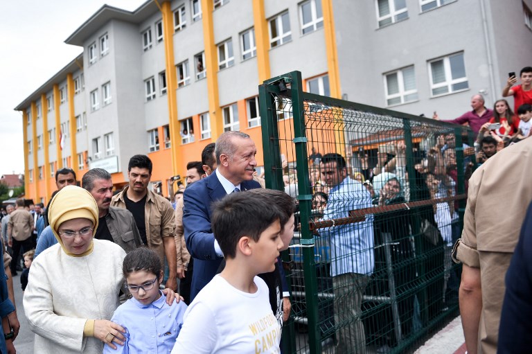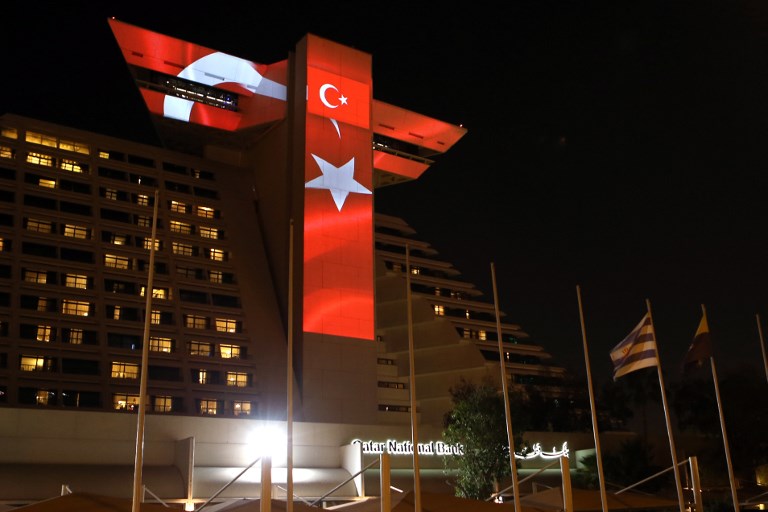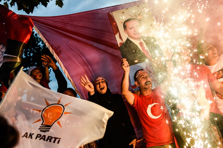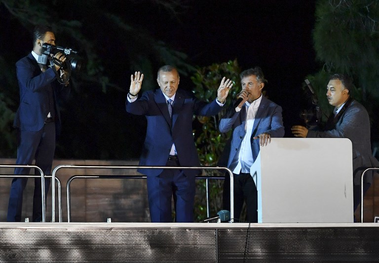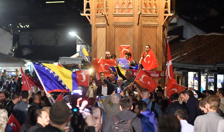 Turkish nationals, supporters of president Recep Tayyip Erdogan, currently residing in Bosnia and Herzegovina, cheer in downtown Sarajevo, late on June 24, 2018. After 15 years in office that have already transformed his country, President Recep Tayyip Erdogan is set to return to power. (STR / AFP)