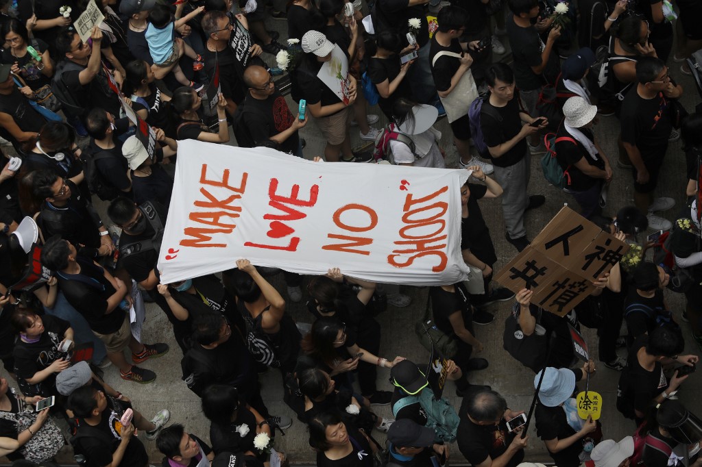 People carry a banner reading "Make love no shoot" in reference to police firing on protesters on June 12, as thousands of protesters dressed in black take part in a new rally against a controversial extradition law proposal in Hong Kong  Dale DE LA REY / AFP