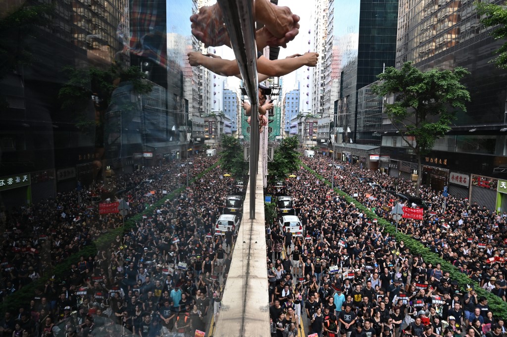 Thousands of protesters (R) dressed in black as reflected on the glass over a balcony (L) as they take part in a new rally against a controversial extradition law proposal in Hong Kong. HECTOR RETAMAL / AFP