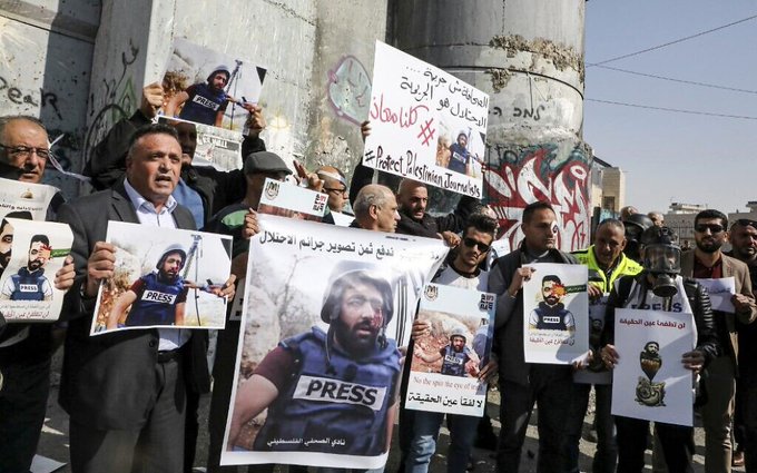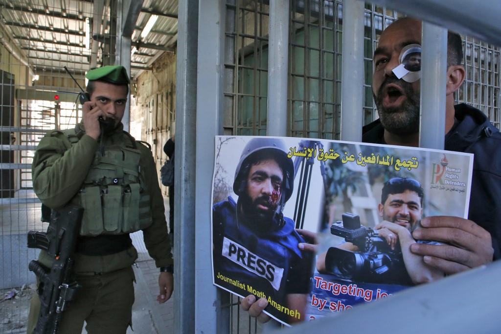 Dozens of Palestinian journalists rallied on Sunday - protesting with one eye covered in solidarity, while hundreds more, including celebrities, imitated the move online using the hashtags #MuathEye, #EyeofTruth and #We_are_MuathAmarneh in Arabic.