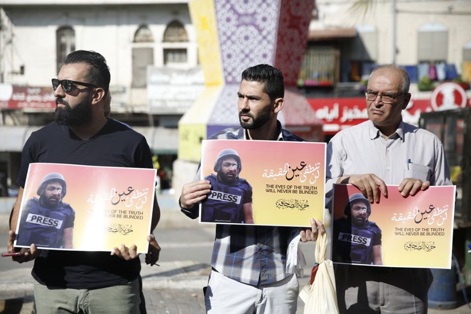 "The eyes of truth will never be blinded," protesters' placards read, as Palestinian journalists wore eye patches on Sunday to decry the wounding of a colleague in the occupied West Bank.