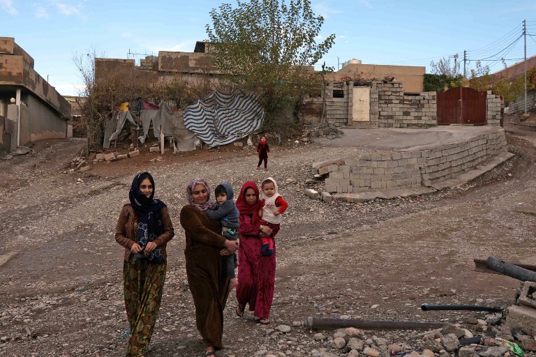 Women carry children as they walk in Sharboty Saghira, a small village east of regional capital Arbil. SAFIN HAMED / AFP