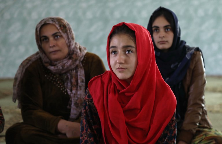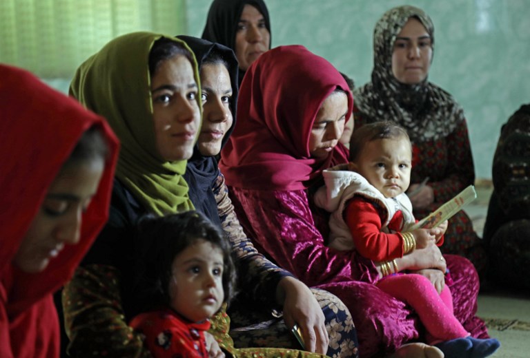 Women and young girls listen to Rasul, an Iraqi Kurdish activist with the non-profit organisation WADI, as she peaks about the harms of genital mutilation in Sharboty Saghira, a small village east of regional capital Arbil. SAFIN HAMED / AFP