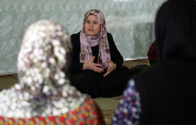 Rasul (C), an Iraqi Kurdish activist with the non-profit organisation WADI, speaks to women and young girls about the harms of genital mutilation in Sharboty Saghira. SAFIN HAMED / AFP
