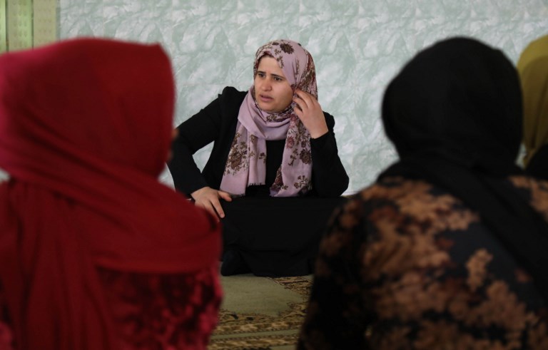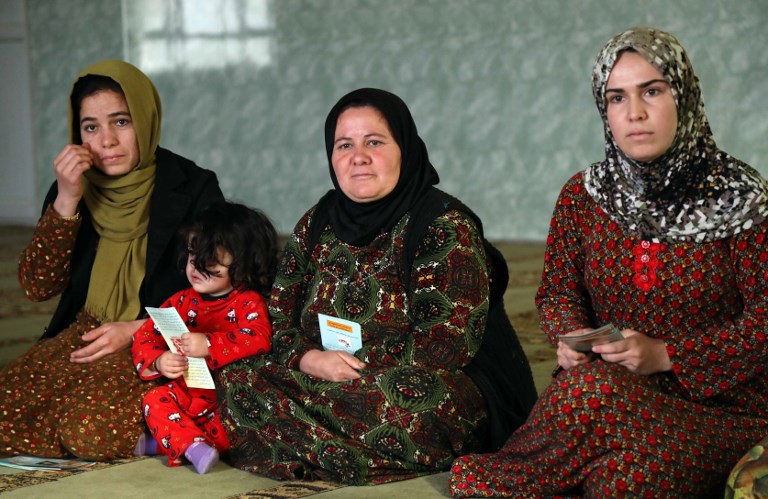 Women and young girls listen to Rasul (not pictured), an Iraqi Kurdish activist with the non-profit organisation WADI, as she peaks about the harms of genital mutilation in Sharboty Saghira. SAFIN HAMED / AFP