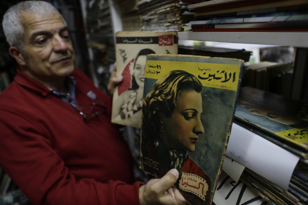 Abboudi Abu Jawdeh shows part of his vintage Lebanese cinema specialised magazines collection at his office in the Lebanese capital Beirut JOSEPH EID / AFP