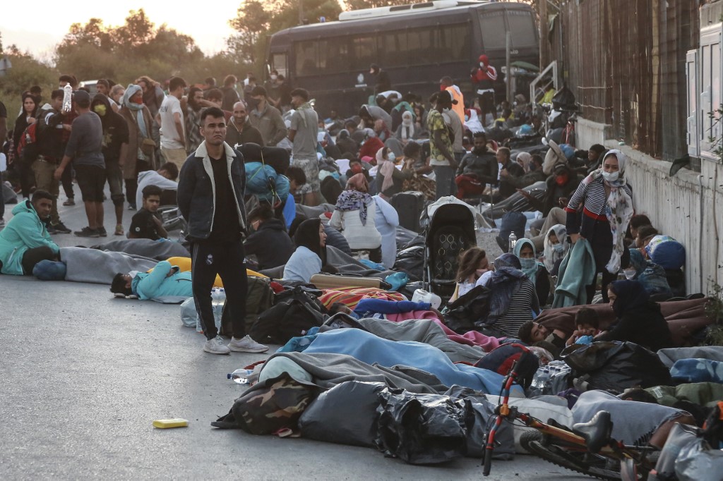 People stand in a street on the island of Lesbos after a major fire broke out in the camp of Moria, on September 9, 2020. Thousands of asylum seekers on the Greek island of Lesbos fled for their lives on September 9, 2020 as a huge fire ripped through the camp of Moria, the country's largest and most notorious migrant facility.