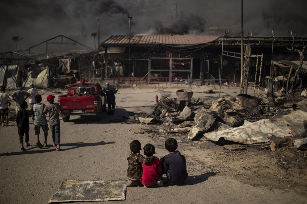 Children sit on the ground in the burnt camp of Moria on the island of Lesbos after a major fire broke out, on September 9, 2020. Thousands of asylum seekers on the Greek island of Lesbos fled for their lives on September 9, 2020 as a huge fire ripped through the camp of Moria, the country's largest and most notorious migrant facility.