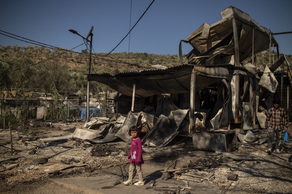 A girl stands amid rubbles in the burnt camp of Moria on the island of Lesbos after a major fire broke out, on September 9, 2020. Thousands of asylum seekers on the Greek island of Lesbos fled for their lives on September 9, 2020 as a huge fire ripped through the camp of Moria, the country's largest and most notorious migrant facility. Over 12,000 men, women and children ran in panic out of containers and tents and into adjoining olive groves and fields as the fire destroyed most of the overcrowded, squalid