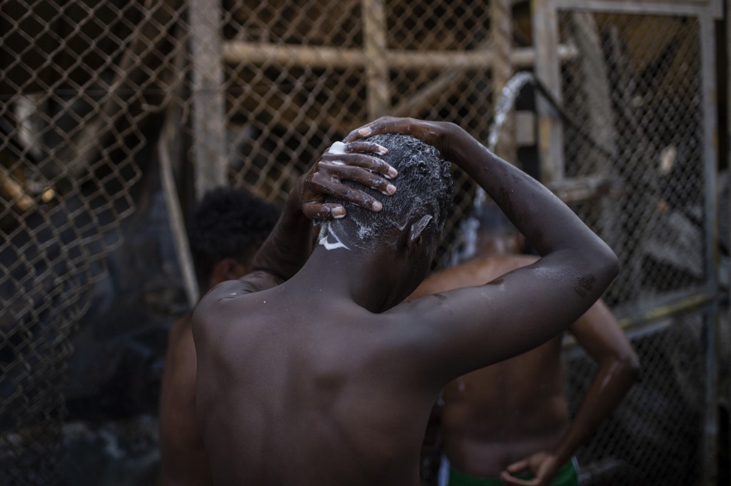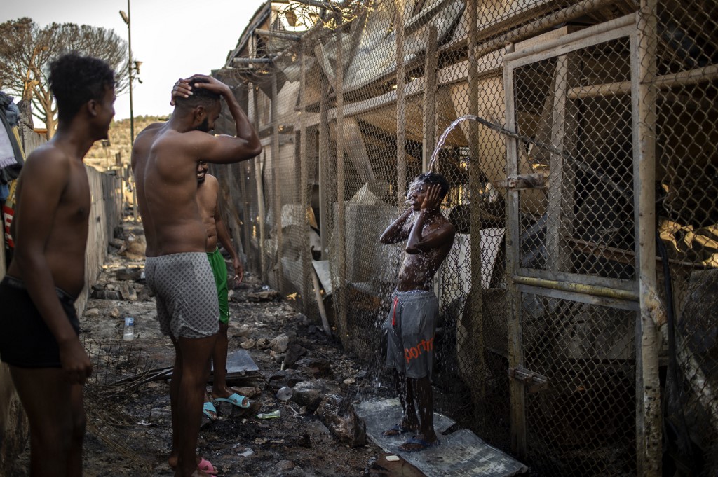 Migrants take shower Children walk in the burnt migrants camp of Moria on the Greek Aegean island of Lesbos on September 9, 2020 after a major fire broke out. Thousands of asylum seekers were left homeless on September 9 after a fire gutted Greece's largest migrant camp on Lesbos, plunging the island into crisis and provoking an outpouring of sympathy from around Europe and calls for reform of the refugee system.