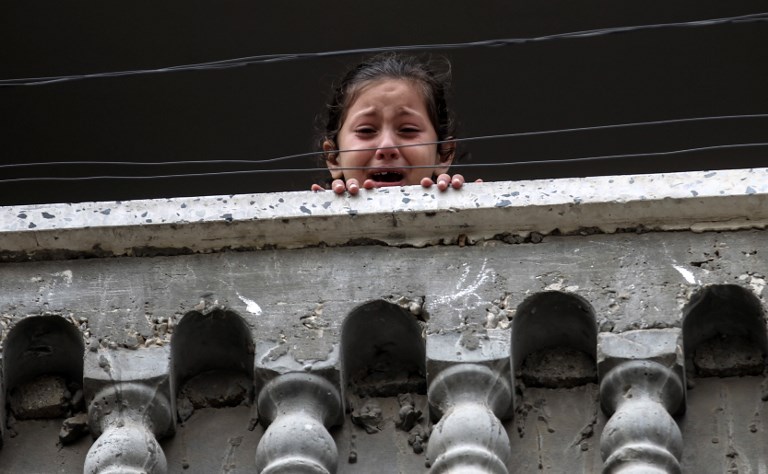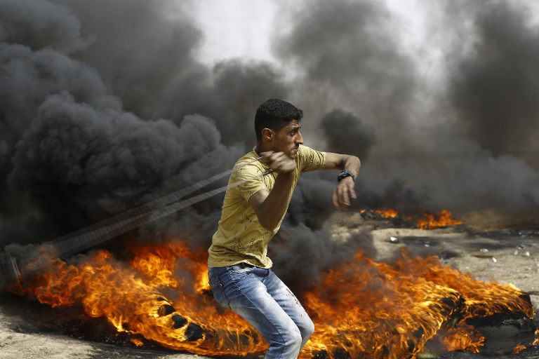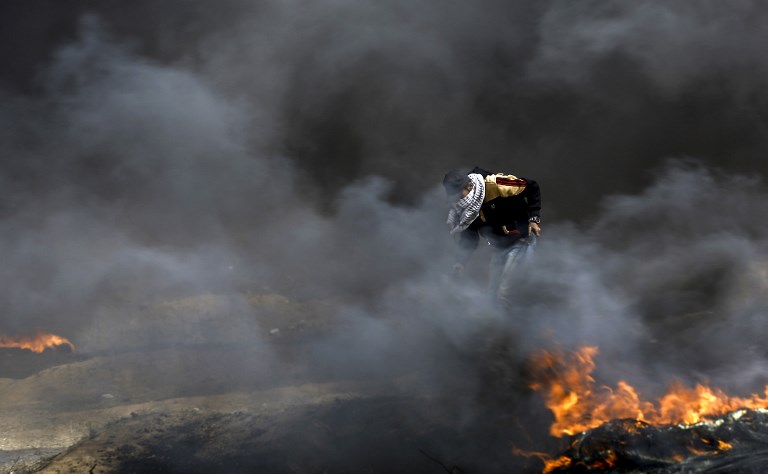 Palestinianian protester runs for cover amidst the fumes from burning tires during clashes with Israeli forces across the border, following a demonstration calling for the right to return -- meaning Palestinian refugees being allowed to go back to the land they fled or were expelled from during the 1948 war surrounding Israel's creation -- near the border with Israel, east of Gaza City, in the southern Gaza Strip, on April 20, 2018.